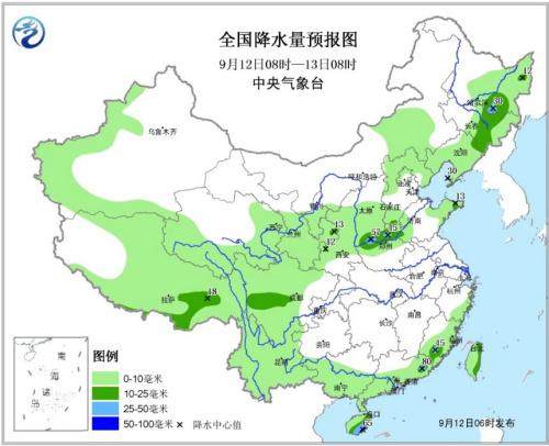 12日08时至13日08时,新疆西部、西北地区东部、青海南部和东部、西藏大部、内蒙古中部、东北地区中东部和南部、华北大部、山东东部、四川大部、云南、华南南部和东部等地有小到中雨或阵雨,其中,海南岛东南部、广东东部等地局地有大雨或暴雨(50~80毫米);上述局地并伴有短时强降水和雷暴大风等强对流天气。南海中部和南部海域将有6~8级、阵风9级的旋转风。