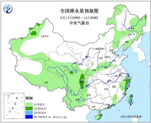 13日08时至14日08时,新疆西部、内蒙古东部、东北地区大部、华北南部、陕西南部、甘肃南部、青海南部、西藏中东部、四川大部、云南、贵州西部、海南岛、广东东部、福建东部、浙江大部、台湾等地有小到中雨或阵雨,局地大雨或暴雨(50~90毫米);上述局地并伴有短时强降水等强对流天气。巴士海峡、台湾以东洋面将有7~11级大风,阵风10~13级,台风中心经过的附近海域的风力可达14级以上;南海中北部海域将有6~8级大风、阵风9~10级。