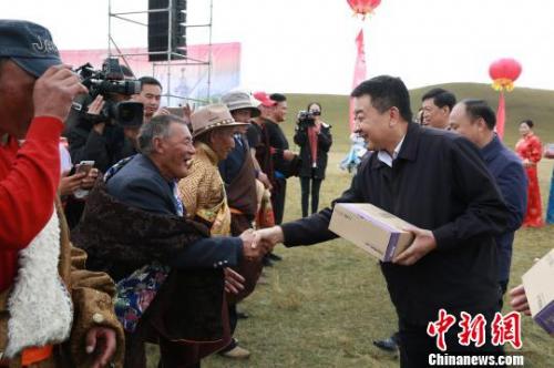 图为启动仪式现场,青海省委常委、宣传部长张西明向当地牧民发放收音机。 罗云鹏 摄