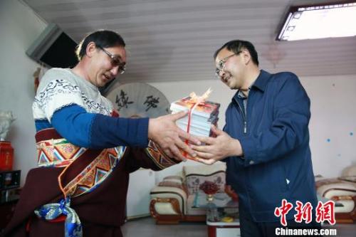 图为牧民收到安多藏语译制片“礼包”。 罗云鹏 摄