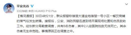 接报后,公安、消防民警迅速到场开展现场处置和伤员救助工作。经东新分局勘查调查,共有8名伤者,其中2人经医院抢救无效死亡。其余伤者无生命危险。事情原因正在调查之中。中新网6月30日电