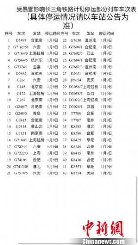 针对暴雪可能带来的影响,中国铁路上海局集团有限公司对1月9日部分列车停运。同时,密切关注强降雪情况变化,适时采取停运、停售、限速、迂回、折返、加开、恢复开行等措施,动态调整列车开行方案,确保旅客出行安全。