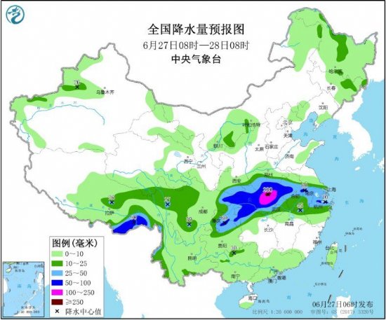 预计,6月27日08时至28日08时,四川盆地东部、贵州北部、湖南北部、陕西南部、江汉、河南中南部、安徽中部、江南东北部等地的部分地区有大到暴雨,其中,河南南部、湖北中西部等地的部分地区有大暴雨或特大暴雨(100~280毫米)。上述部分地区伴有短时强降水(最大小时降雨量30~50毫米,局地可超过70毫米),局地有雷暴大风等强对流天气。中央气象台6月27日06时发布暴雨黄色预警。