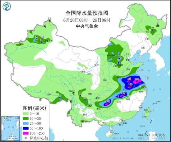 6月27日08时至28日08时,新疆沿天山西部、内蒙古河套地区、黑龙江中部、吉林东部、四川西部和南部、西藏东部、云南西部和南部、西南地区东北部、陕西南部、江汉、黄淮西部、江淮大部、江南北部、广西北部等地的部分地区有中到大雨,其中,西南地区东北部、江汉大部、黄淮西部、浙江北部、江苏西部等地的部分地区有暴雨,局地大暴雨或特大暴雨(100~280毫米)。内蒙古西部和中部、黄淮西部、江汉东部等地的部分地区有4~5级风。东海北部有6~8级风、阵风9~10级。杭州湾北部有8~10级雷暴大风。